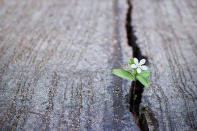 white flower growing on crack street, soft focus