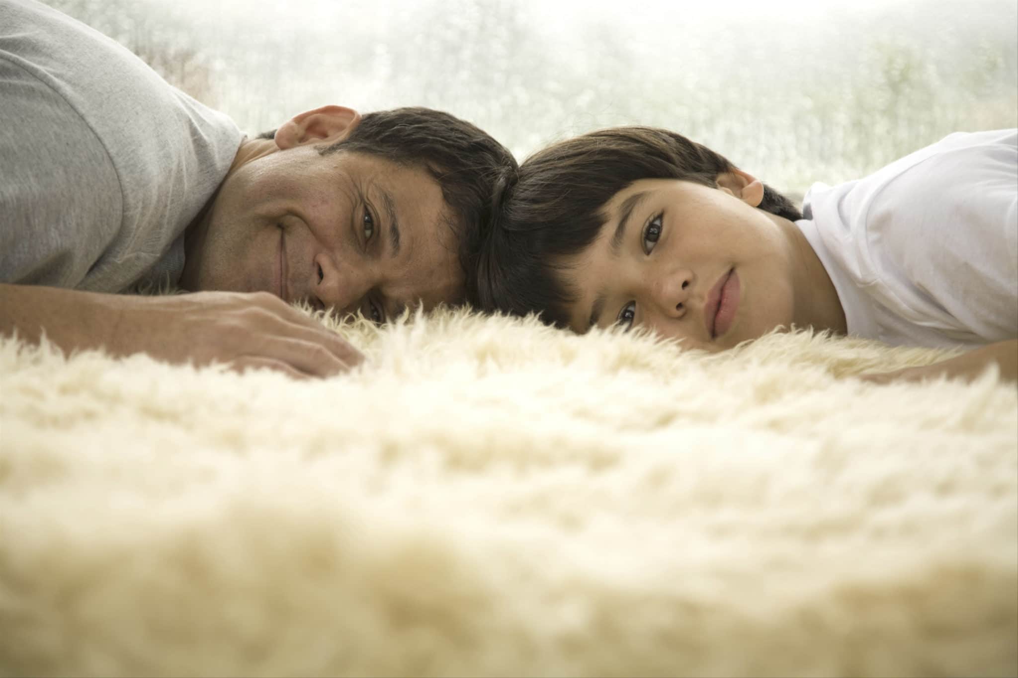 Portrait of mature man lying on rug with his son (8-9)