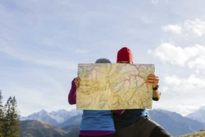 Couple hikers with map in mountains