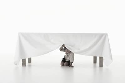 Boy (4-5 years) peeking from under tablecloth, studio shot, portrait