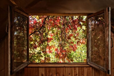 Llush autumn foliage in the window of a country house