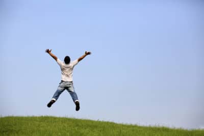 Freedom Young man jumping over the field with outstretched hands.